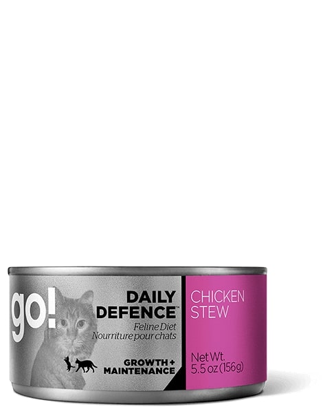 GO! DAILY DEFENCE™ Chicken Stew cat food is formulated to meet the nutritional levels established by the AAFCO Cat Food Nutrient Profiles for Growth & Maintenance.