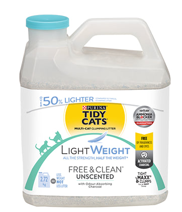 Tidy added all the tight-clumping, odour-fighting power of TidyLock Protection AND Ammonia Blocker technology to this unscented cat litter, but removed the dyes, fragrances and half the weight. How? Tidy innovation, and the odour-absorbing power of activated charcoal.
