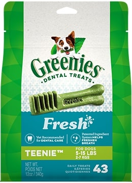 One GREENIES™ Fresh Flavor Dental Treat is all it takes for clean teeth, fresh breath and a happy dog. Your dog can't wait to sink their teeth into these delicious dental dog chews because they are bursting with breath-freshening mint flavor and feature a delightfully chewy texture that fights plaque and tartar. Irresistibly tasty and incredibly powerful, GREENIES™ Treats for Dogs are recommended by veterinarians for at-home oral care. Best of all, these dog treats are made with highly soluble ingredients that are easy to digest. Give your dog the mouth-wowing treat that helps promote oral health with GREENIES™ Dog Treats.