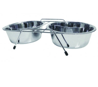 Two tiny stainless steel bowls with holder. Half pint capacity, bowls are approximately 4" diameter. Feeder set is 9.25" long.