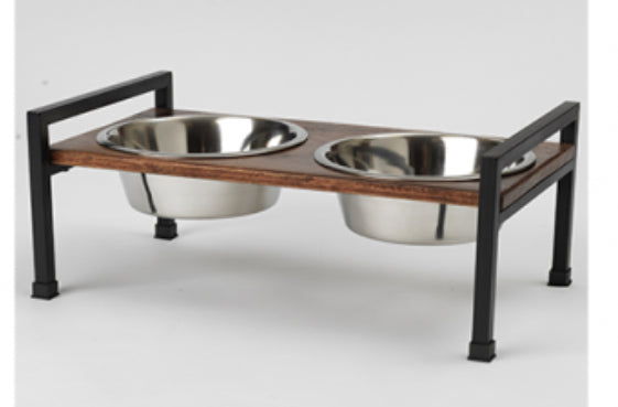 Martinique Natural diner features two removable stainless steel bowls with 1 pint, 1 quart or 2 quart capacity each, a durable mango hardwood table, and rubbed bronze steel legs with non-slip footings.