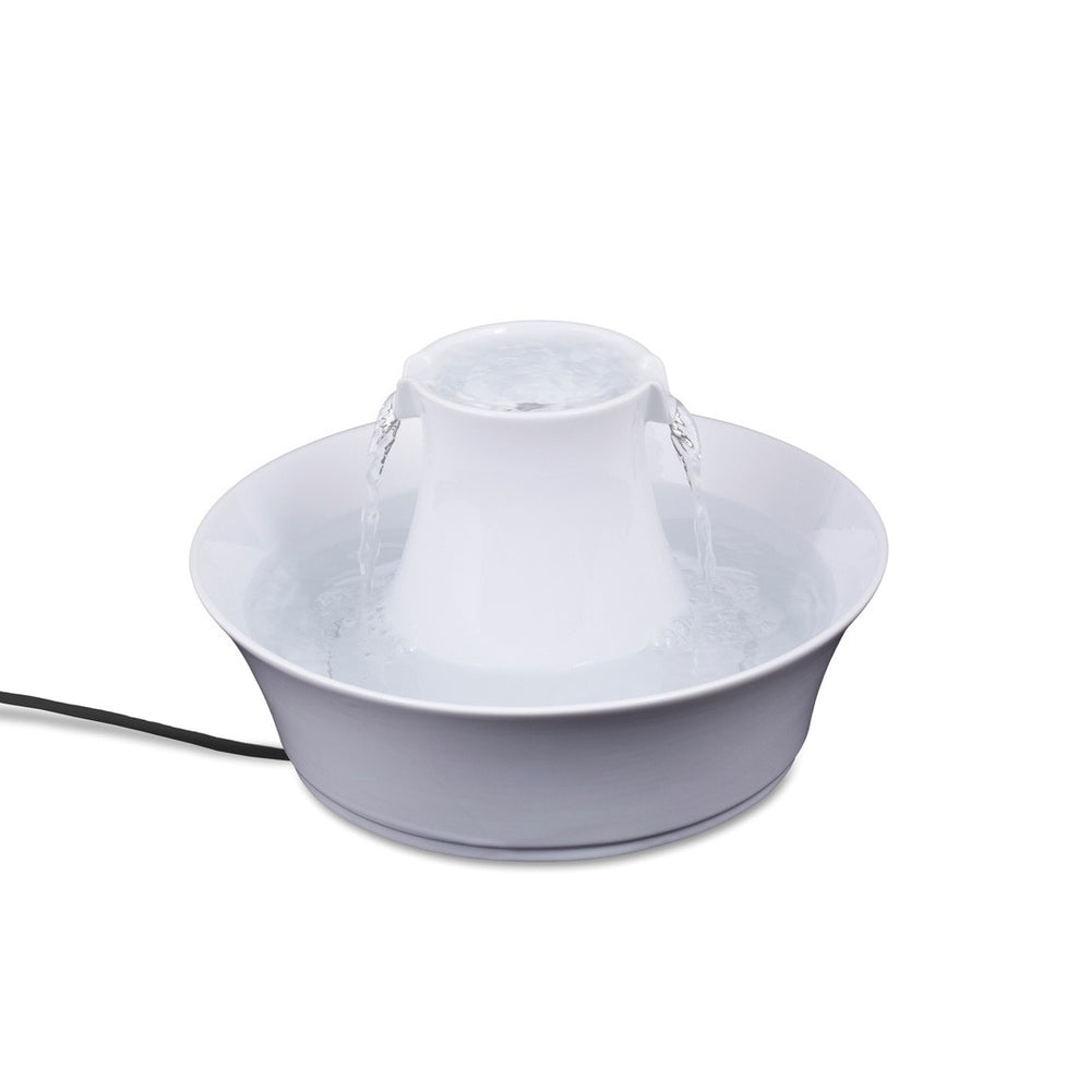Keep your best friend healthy and hydrated with the PetSafe® Avalon Pet Fountain. This pet fountain has 2 free-falling water streams that encourage your cat or dog to drink more water. Free-falling streams add more oxygen to the water to keep it fresh for your pet. An activated carbon filter removes bad tastes and odors from your cat’s water, and the foam filter helps catch pet hair and other debris to keep the water clean. This fountain holds 70 ounces of water and has an open-bowl design, so if your home loses power, your pet will still have access to water. The white, hygienic porcelain fountain will blend seamlessly with your home décor. When it’s time to clean your fountain, simply place the fountain in the top rack of your dishwasher and hand wash the pump separately. PetSafe® brand is here to help you and your pet live happy together™.