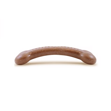 PRECAUTION: Flavorit BarkBones are hefty in size and have a curved design so that it's easier for your dog to pick up and hold with their mouth. Don't be surprised if your dog creates granules of nylon while chewing. These little rice size bits are usually not swallowed, but if they are, they'll pass without a problem. For a satisfying chew experience, your dog should be able to do some damage to the toy. The texture should be scratchable, not glass-hard. As always, remember to monitor your dog when new toys or chews are introduced. If your dog happens to break pieces off, immediately remove the toy from being chewed on.