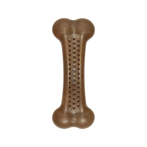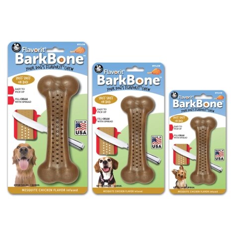 Pet Qwerks® Flavorit BarkBones® infused with Mesquite Chicken flavoring are made with USA sourced nylon and are designed for aggressive chewers. Available in three sizes, Flavorit BarkBones with mesquite chicken flavoring are attractive to dogs and help promote healthy teeth and chewing habits. The tiny flavor cells all over the bone can be filled with spreadable treats like peanut butter, cheese, cream cheese, or any other spreadable treat your dog enjoys. Give your dog a tasty and satisfying chew experience with Pet Qwerks Flavorit BarkBones.
