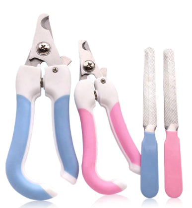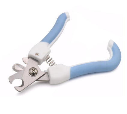 A spring assisted nail clipper in two sizes, 5.5" total length for small-medium breed dogs and 6.5" total length for medium-large breed dogs. Both sizes have a moveable safety lock to hold them closed for storage, as well as a moveable nail guard to prevent the nail from going too far through the blades.