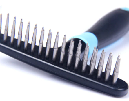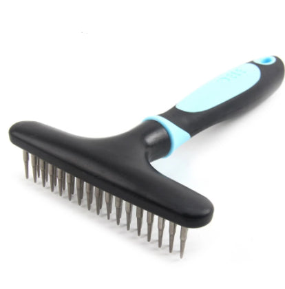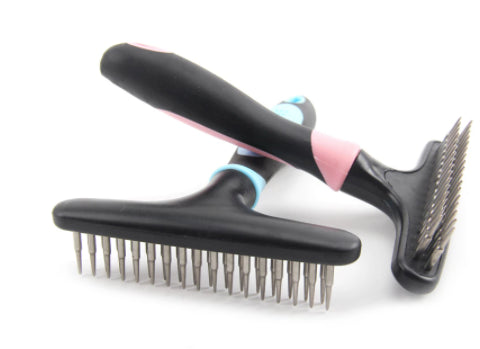 A rake with two staggered rows of tines that are specially tapered to penetrate to the undercoat as efficiently as possible. 4" brushing surface with a generous 5" handle. Perfect for any breeds with thick undercoats.