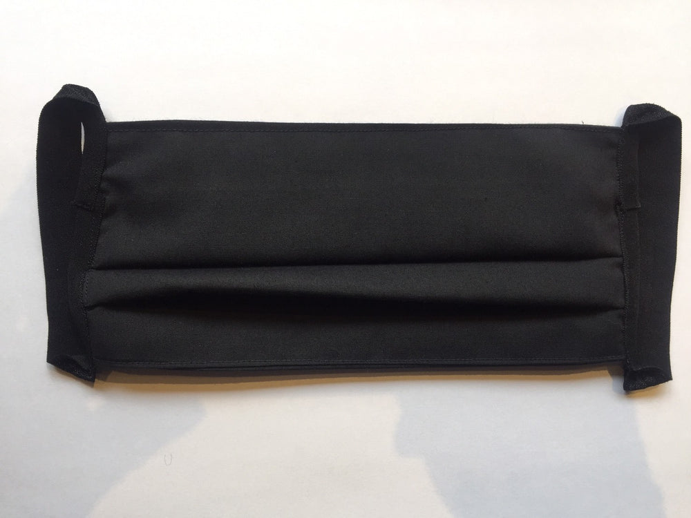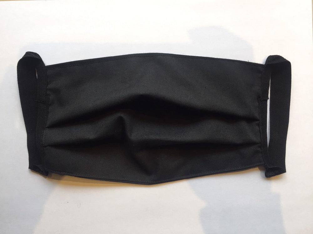 These handmade masks are plain black with two layers of cotton. The elastics are soft (the type used for baby's headbands or non-crease hair ties) and allow the mask to fit a large variety of faces.