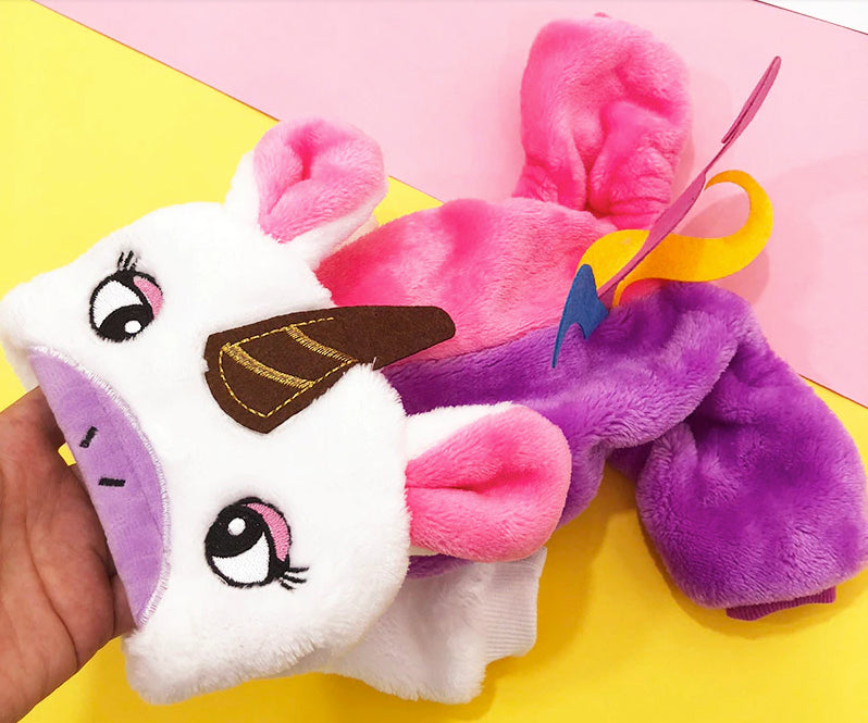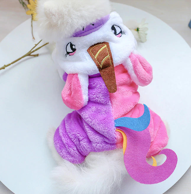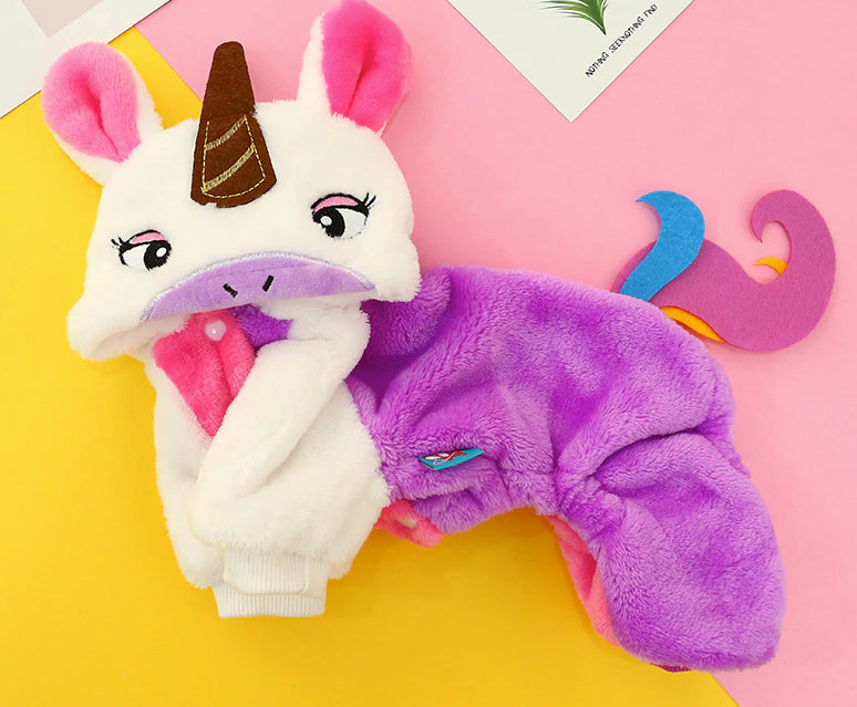 The absolute cutest colourblocked unicorn onesie, featuring a colourful felt horn and tail that stick out, and a sweet embroidered face. Snaps up the front, even has a leash hole for walking outside!