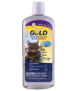 Sergeant's Gold Flea and Tick Shampoo contains pyrethrins, a special insecticide, to kill fleas and ticks as you bathe your cat. It also contains pyriproxyfen, which makes new fleas unable to reproduce and kills eggs for four weeks. This shampoo has a spring freesia fragrance, leaving your cat smelling fresh.