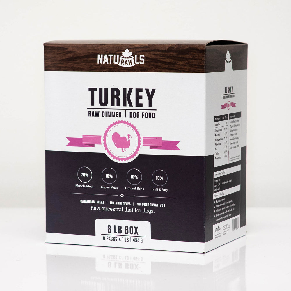 Turkey muscle meat (including heart, gizzard), turkey bone, turkey organ (liver), spinach, carrot, pumpkin, green bean, cranberry, blueberry, apple cider vinegar, alfalfa.