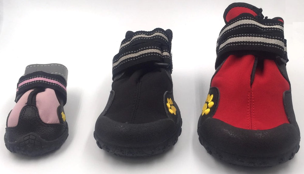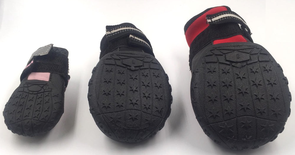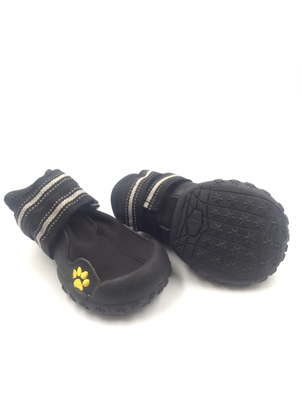 These are the best big dog shoes we've found. With a wide strap that cinches tightly around the ankle, they really don't come off; and there's a safety strap just in case that one gets loose. The other problem with large dog boots is that the bottoms often wear through very quickly, but these ones are nice and thick rubber with lots of tread so your dog can be as energetic as he or she wants. The rubber sole comes over the toe and up to the straps on the back, meaning no matter how your dog walks they won't be causing unintended wear on the fabric part of the shoe.