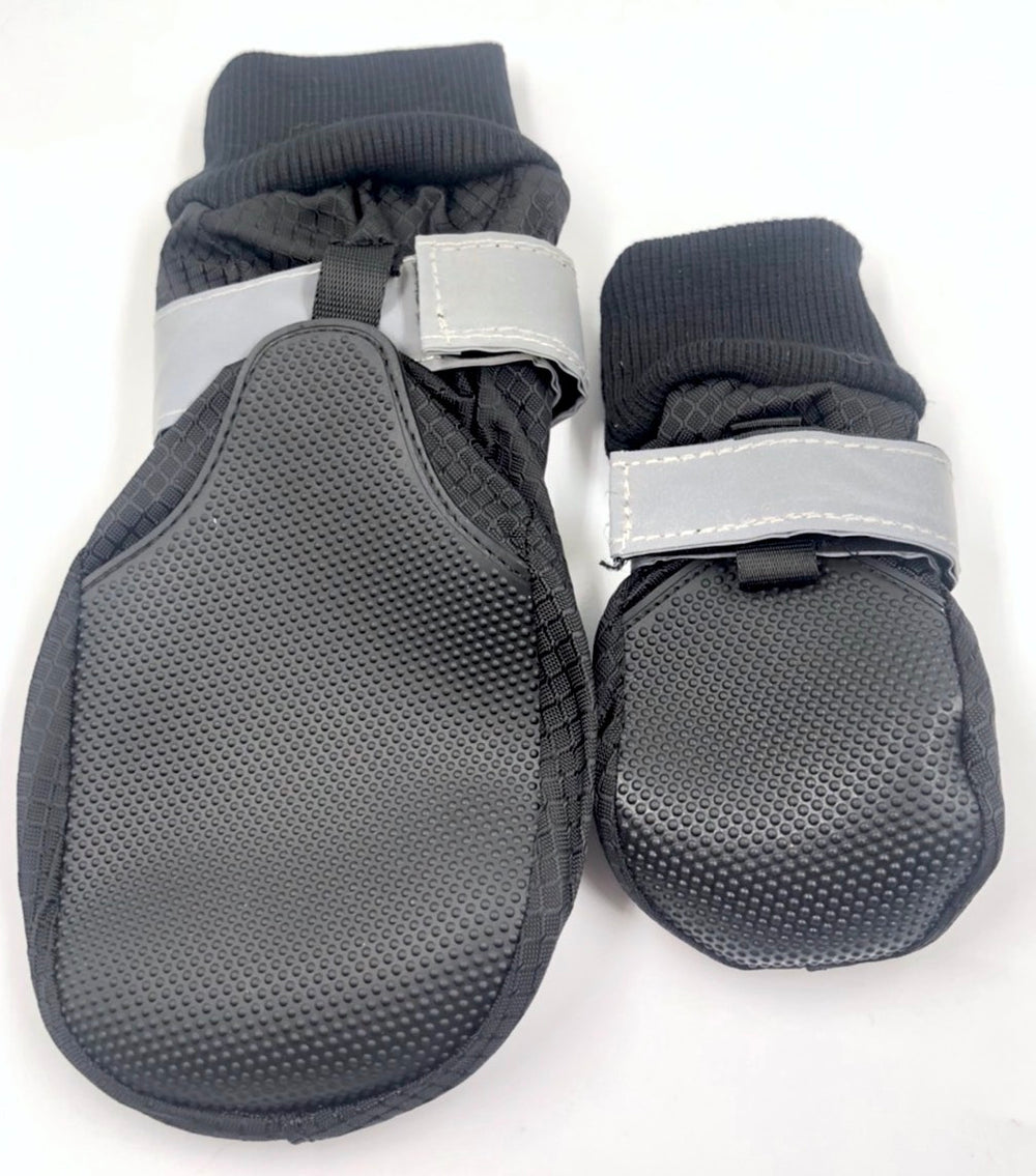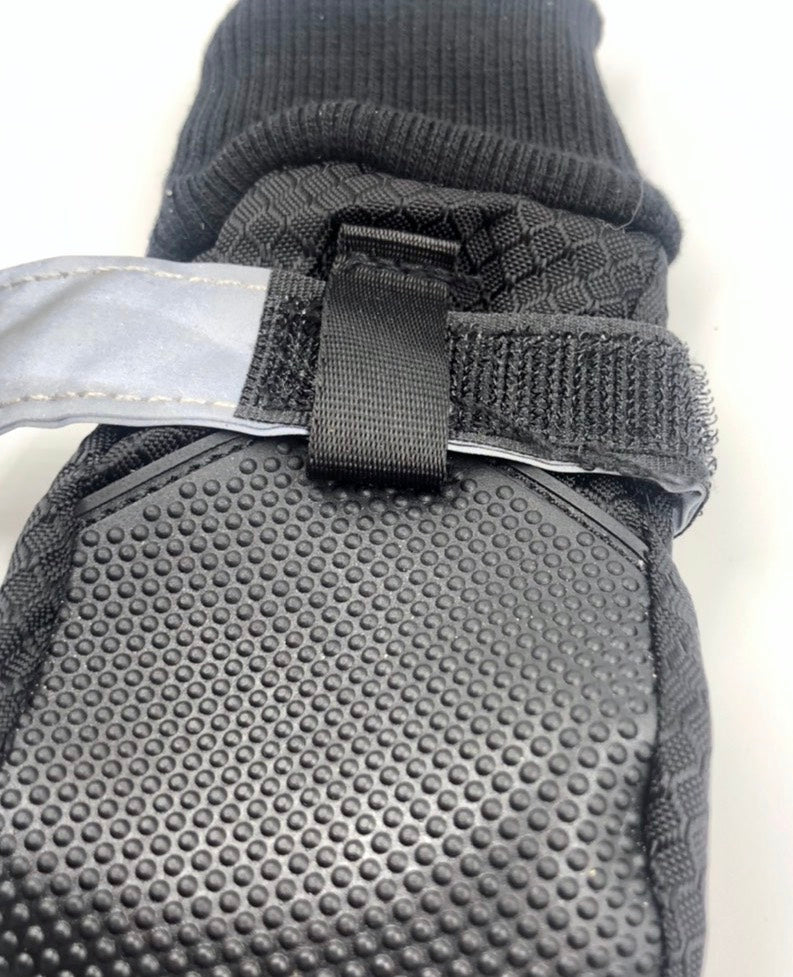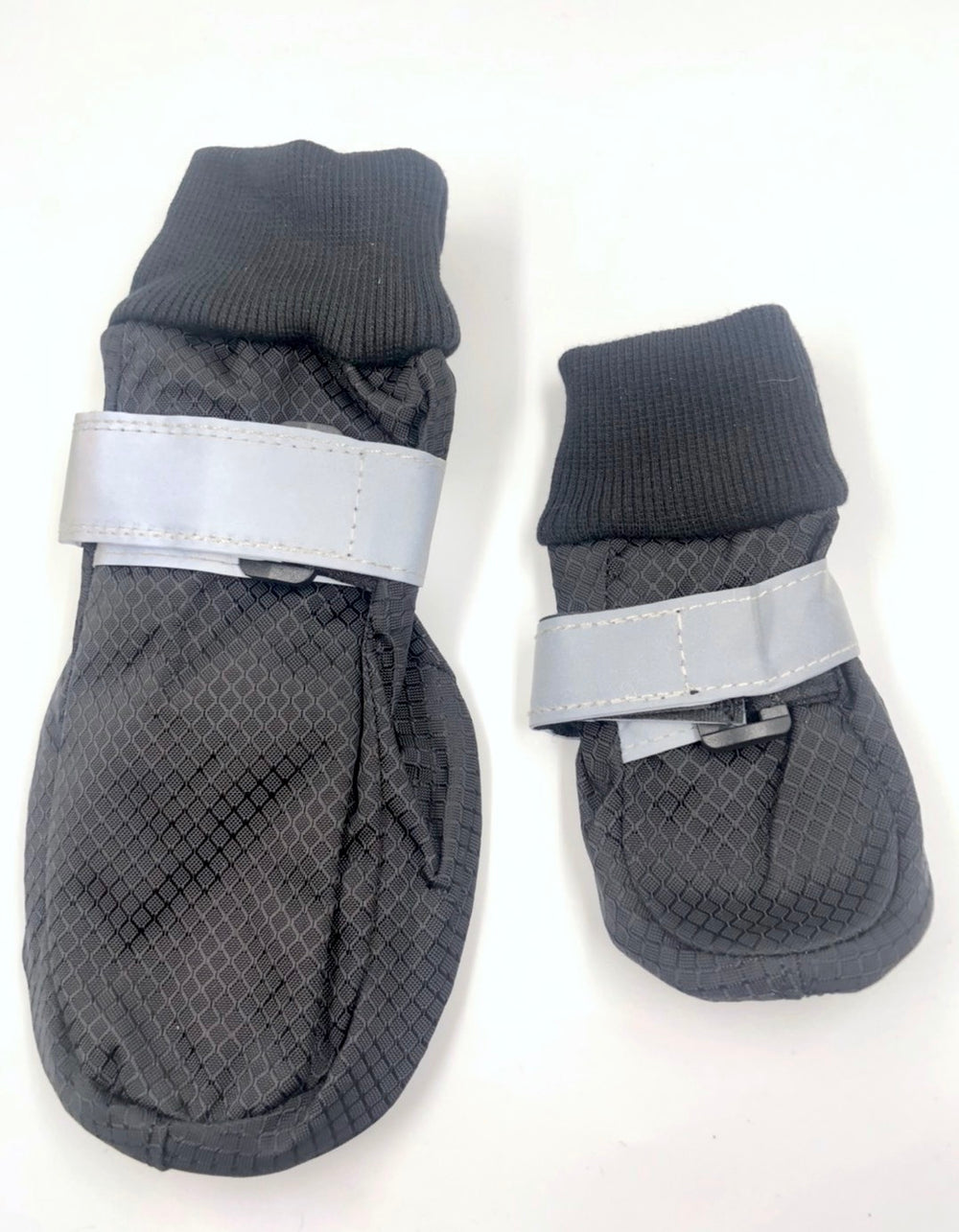 A comfortable and durable dog shoe that features a water resistant ripstop nylon outer and a fleece lining. A cotton cuff folds down easily to allow the shoe to be put on. Most importantly, the sole is a thick and textured rubber, meaning the shoe will be long lasting for even large and heavy dogs. A perfectly placed wide ankle strap has the vital cinch buckle at the front, allowing the strap to be pulled much tighter than you could manage wrapping it manually. There's also a thoughtful belt keeper in the back, meaning the strap will stay exactly at the ankle and not slide around - a cause of many lost shoes. The belt keeper is even anchored on the sole of the shoe (on all but XXL size) to prevent the strap from putting pressure on the fabric.