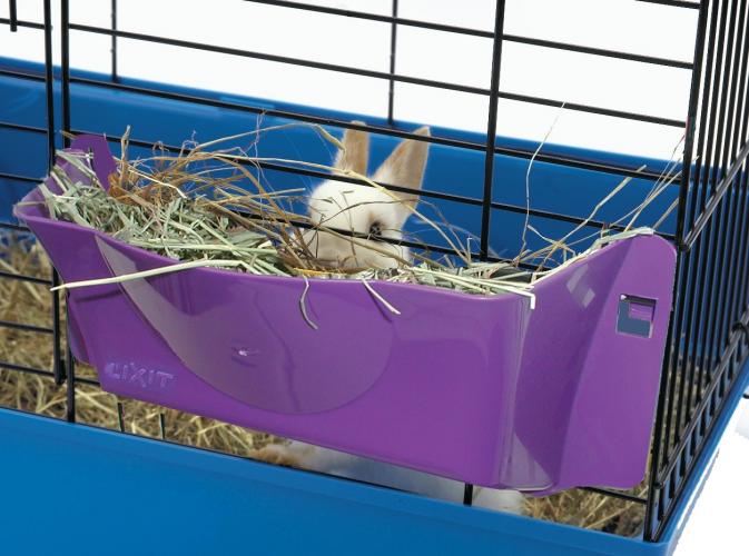 Plastic hayrack, clips to outside of cage to dispense hay to rabbits and guinea pigs, helps keeps hay fresh and clean.