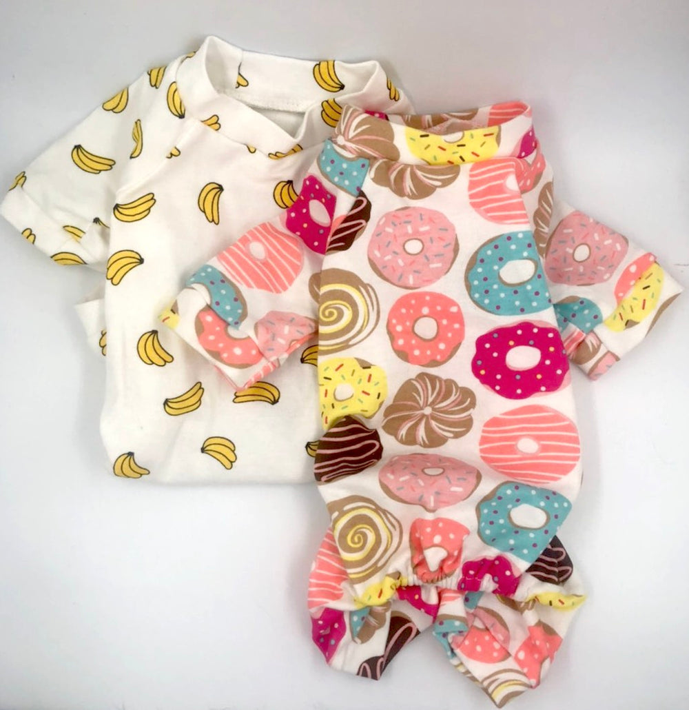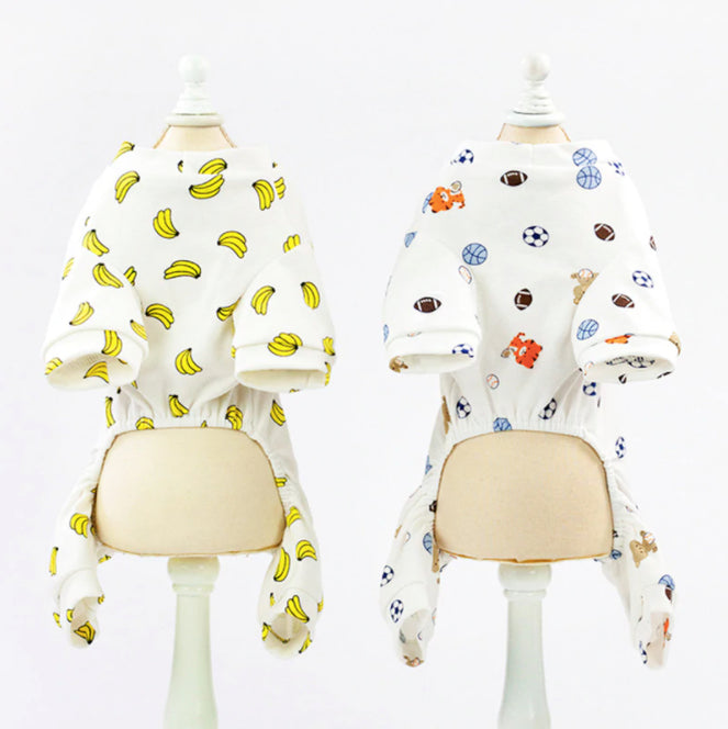 This is an exceptionally well fitted pajama made out of a thick cotton jersey. The entire belly/bum opening is elasticized which makes sure that the back legs stay in place, and raglan sleeves allow for a great fit over wide shoulders. Though it fits many dogs of different sizes, the neck and shoulders area combined with the generous measurements of the XXL are ideal for a Frenchie.