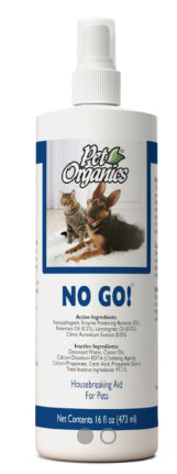 Pet Organics No Go! has been developed to help you housebreak your pet. No Go! is not a repellent. When sprayed on the soiled area, No Go! will eliminate the urine scent so your pet will not re-urinate in that area. Works great on indoor plants and Christmas Trees too! No Go! contains no harsh chemicals. Safe to use on almost all fabrics, however, before using product test on small inconspicuous area of surface.