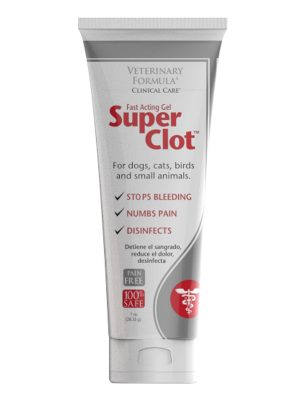 Veterinary Formula Clinical Care Super Clot is a fast acting gel that stops bleeding fast, relieves pain and disinfects, too – all while easily applied with a new easy-to-use applicator. Super Clot halts bleeding that is associated with minor cuts, surgical wounds, tail docking, ear cropping, nail trimming and dew claw removal. It comes in an easy to use applicator that provides controlled and accurate application. Super Clot is used in place of styptic powders and pencils that don’t have its disinfecting and numbing properties nor its ease of use.